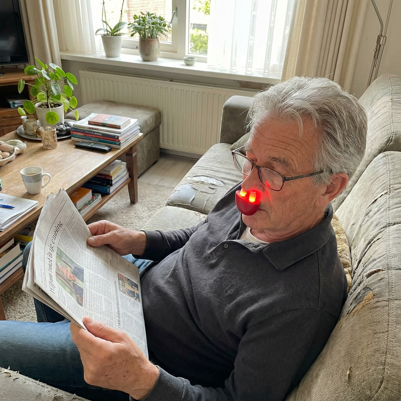 Een compact neusapparaat met rood licht, ontworpen voor dagelijks ademcomfort.